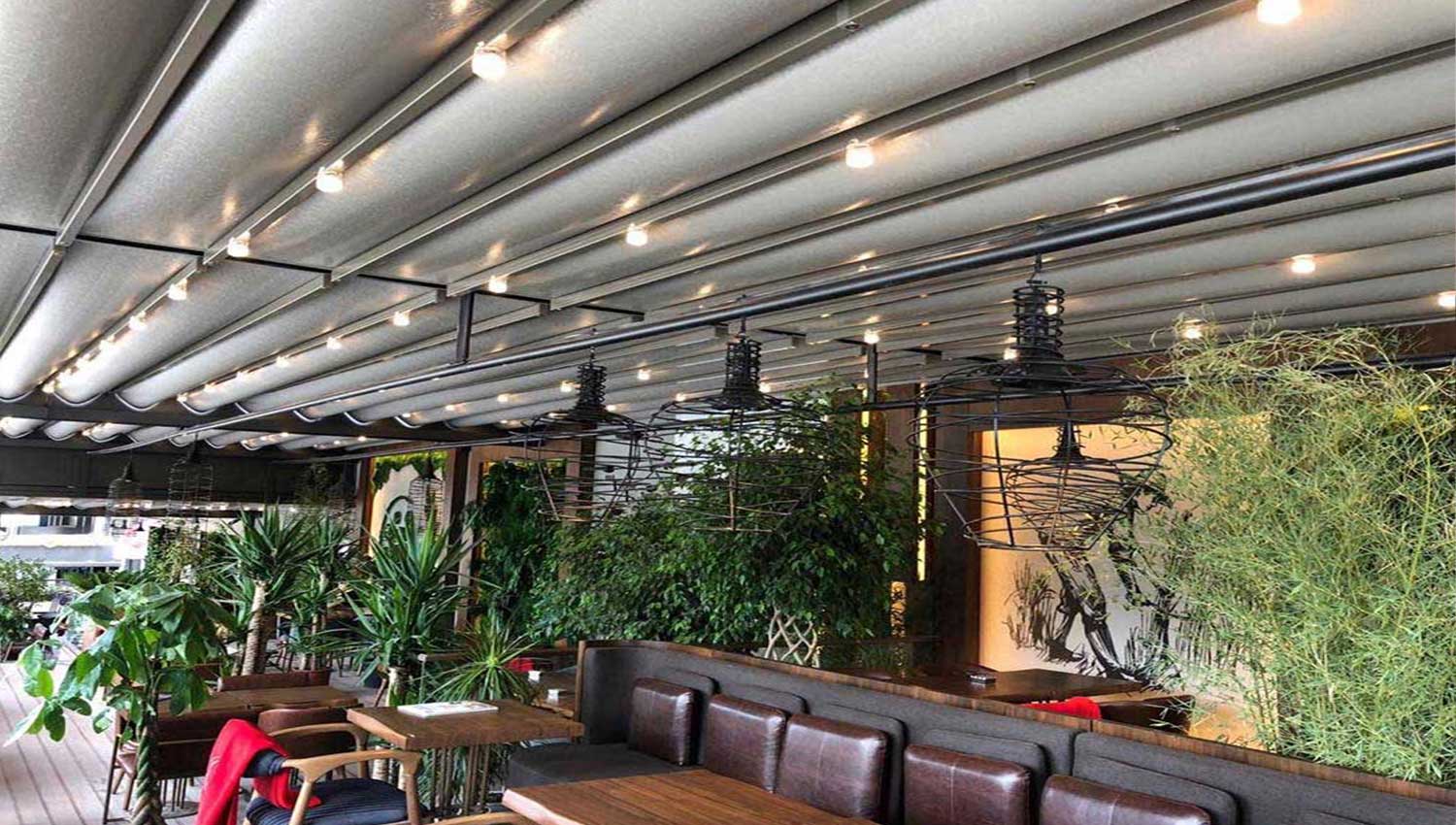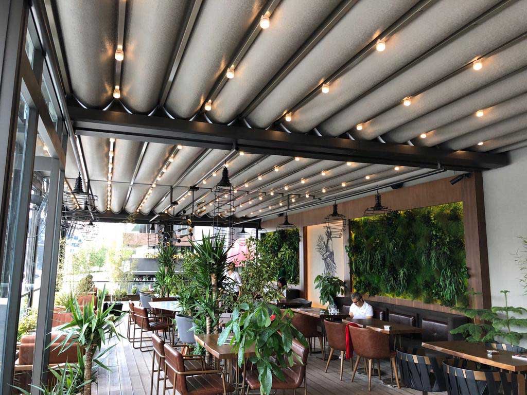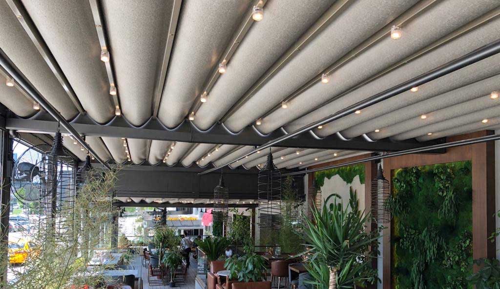Sanremo Flat Raylı Tente Sistemi eğimsiz açılır kapanır mekanizması sayesinde ve ısı kesme, su geçirmeme ayrıca oluşabilecek yangın esnasında alev almayı engelleyici özelliğe sahip blackout kumaşı sayesinde yaşam alanınızda dört mevsim konforlu bir şekilde vakit geçirebilirsiniz. Flat sistemimizin eğimsiz ve dekoratif yapısı ile mekanınıza havadar bir görünüm katmaktadır.